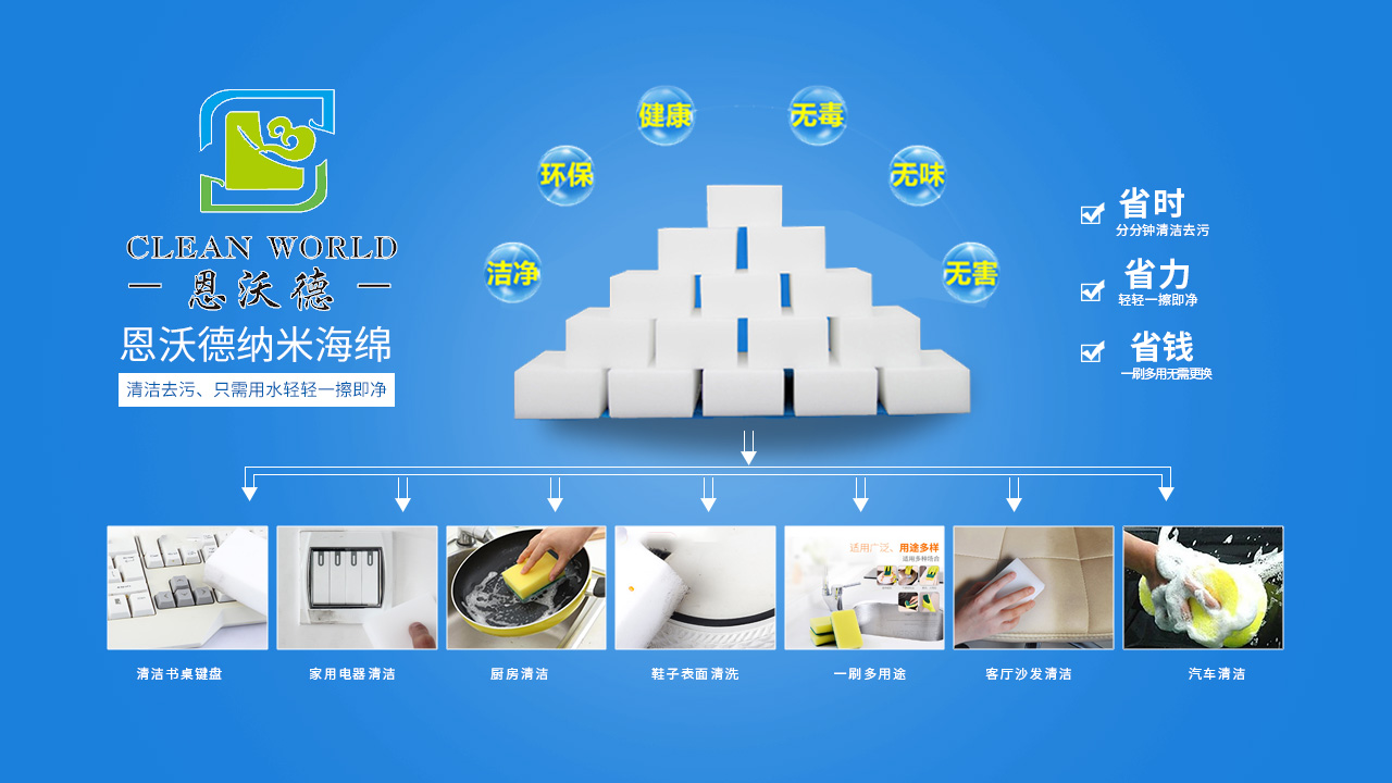 納米海綿是一種有高開孔率的三維網(wǎng)格結(jié)構(gòu)的新型泡沫塑料,采用物理去污的機理,依靠納米海綿特殊三維網(wǎng)狀結(jié)構(gòu)(每個小顆粒比頭發(fā)絲的萬分之一還小)將其浸濕后,其內(nèi)部就會形成無數(shù)個納米級毛細(xì)管開孔結(jié)構(gòu),在抹拭過程自動吸附物體表面的污漬。所以這些海綿塊只需要加一點水,就變成清潔力強的產(chǎn)品,可以擦拭頑固的污漬,也不用擔(dān)心會有刺激性化學(xué)物質(zhì)。納米海綿可以用于家中的大多數(shù)物品的表面,從油煙機到灶臺、墻壁上的畫畫印記、浴室里的水漬水垢、浴缸污垢、茶杯里的茶漬、墻壁劃痕等通常難以擦洗的表面。